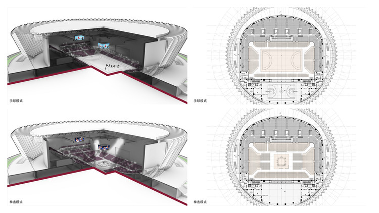 設計功能時,比賽館與訓練館并列布置,比賽館內(nèi)固定的看臺采用 U型三面布置,活動看臺圍合競賽場地四面布置?;顒臃指糍惻c訓練館之間。賽會館、訓練館分別承擔比賽和準備活動。轉化成表演方式后,訓練館可作為文藝表演功能的舞臺。