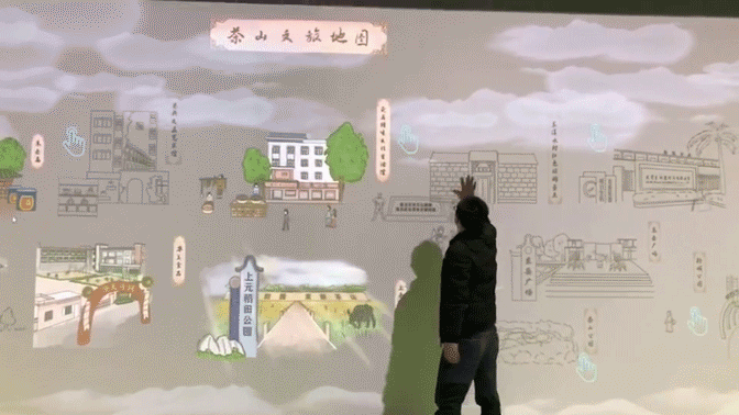 當(dāng)?shù)厝撕屯鈦?lái)游客通過(guò)茶山文旅地圖互動(dòng)墻了解茶山鎮(zhèn)當(dāng)?shù)匚幕?,輕點(diǎn)屏幕灰色圖案涂色,以示其特色景點(diǎn)。